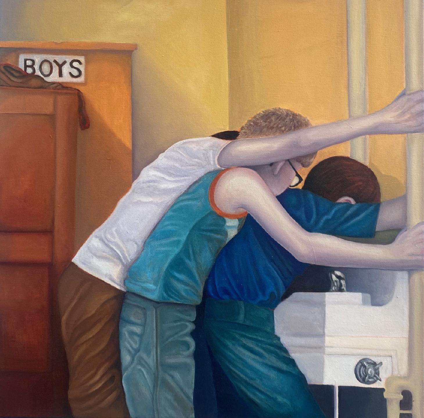 Ginger Snow Semmelhack is a Brooklyn-based oil painter and recent BFA graduate from Kenyon College. She studied at the Student Arts League during high school and later spent time abroad at Bard College Berlin, where she focused on analog film photography and advanced oil painting. Throughout her academics, she maintained an active studio practice, balancing her education with a growing career as an artist. Her work has been exhibited in New York City, Ohio, and Berlin, and has appeared in Hyperallergic, Artnet, and Suboart International Art Magazine. Her second solo exhibition, Boys, will be held at 61 Atlantic Avenue, Brooklyn, on September 5th, 2025, from 6–8 PM. //Semmelhack's exhibition, Boys, invites viewers into playful, surreal scenes that blur the line between horseplay and affection. Semmelhack reinterprets masculinity as something tender, physical, and strangely liberating. Drawn from childhood observations, the paintings in Boys reflect a fantasy of male connection, depicting young men engaging in ritual and closeness—moving through space with ease and physicality. This series serves as a meditation on admiration, envy, and longing for a world that has always felt out of reach. This exhibition explores the softness of platonic love through a rose-tinted female gaze.